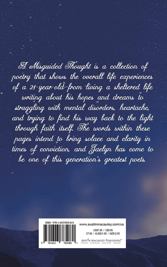 A Misguided Thought is a collection of poetry that shows the overall life experiences of a 21-year-old-from living a sheltered life writing about his hopes and dreams to struggling with mental disorders, heartache, and trying to find his way back to the light through faith itself. The words within these pages intend to bring solace and clarity in times of conviction, and Jaelyn has come to be one of this generation's greatest poets.